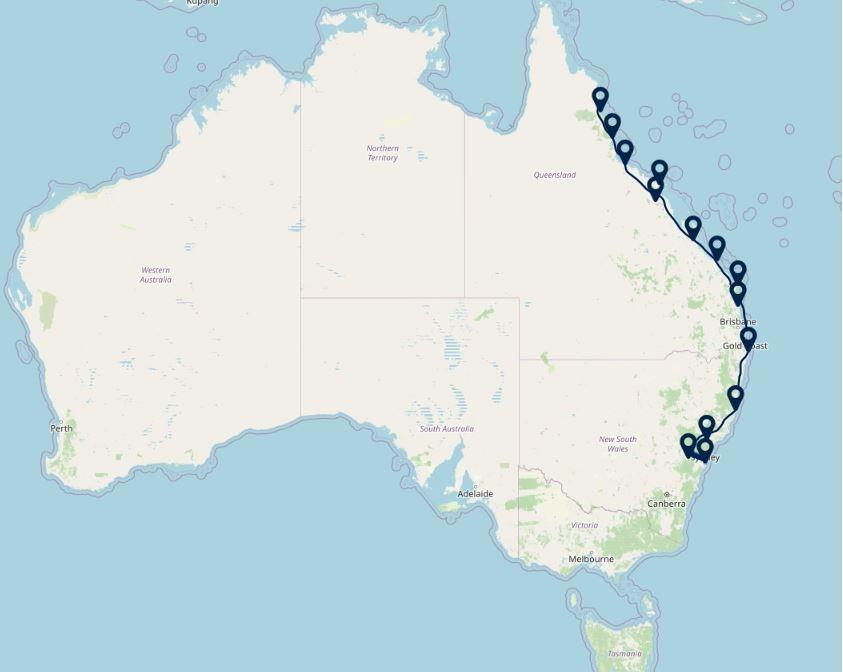 Tijdens deze route reist u van Sydney naar het tropische noorden van Australië, waarbij u langs de oostkust een gevarieerd landschap ontdekt. Van Sydney gaat het richting de Blue Mountains en de wijngaarden van Hunter Valley. U rijdt verder langs de kust naar Port Macquarie en Byron Bay. In Lamington National Park ontdekt u het tropische regenwoud, waarna de route door Noosa en naar K'gari (Fraser Island) leidt. Van daaruit reist u verder via Town of 1770 naar Rockhampton en het ongerepte Eungella National Park. De reis eindigt met een verkenning van Airlie Beach en de beroemde Whitsunday-eilanden en een ontspannen verblijf in Port Douglas, waar het Great Barrier Reef voor een onvergetelijke ervaring zorgt.