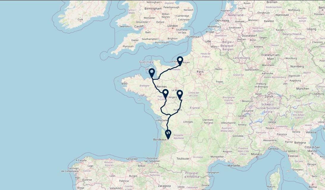 Deze reis biedt een prachtige combinatie van natuur en cultuur. U begint in de adembenemende natuur van de Loirevallei en zet uw reis voort naar de wijngaarden en de historische binnenstad van Bordeaux. U sluit de vakantie af in Saint-Malo, de perfecte uitvalsbasis voor uitstapjes naar onder andere Mont-Saint-Michel en de ruige kust van Côtes d’Amor. Tijdens uw reis overnacht u zowel in charmante boutiquehotels als in imposante chateaus.