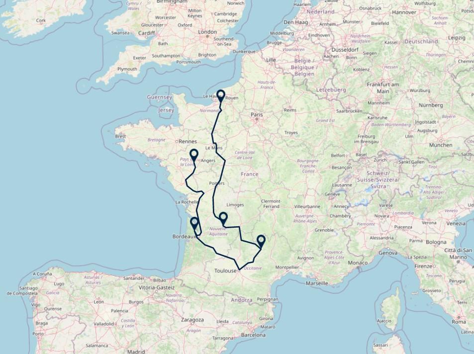 Uw reis start aan de langste rivier van Frankrijk 'de Loire' in het prachtige chateau de l'Epinay. Dit gebied leent zich perfect voor prachtige fietstochten en u heeft de mogelijkheid met onder andere Tours en Angers om bijzondere steden te bezoeken. Uw volgende bestemming ligt ten noorden van Bordeaux. U verblijft in het unieke chateau de Meyre. De omgeving van Bordeaux is bekend om de de vintage wijnen. Er zijn ook vele historische plekken te ontdekken en dit is de uitgelezen kan om een wijncursus doen. Het volgende chateau ligt naast Rodez, de voormalige hoofdstad van de Franse provincie Rouergue. Deze plaats beschikt over een rijke geschiedenis, die helemaal teruggaat tot aan de vijfde eeuw voor Christus. Ook hier is er genoeg cultuur en geschiedenis te ontdekken. Uw reis vervolgd zich naar een prachtig typisch Frans chateau in het dorpje Chancelade. Rondom Chancelade liggen verschillende parels klaar om ontdekt te worden. Zo dateert Perigueux uit de Romeinse tijd waar het oude stadscentrum wordt gedomineerd door de middeleeuwse straten met her en der grootse stadspaleizen. De reis wordt afgesloten met een heerlijk verblijf in het binnenland van Normandië, nabij het sfeervolle plaatsje Pont-Audemer. De bekende bezienswaardigheden van Normandië, zoals de krijtrotsen van Etretat en Honfleur, liggen op korte afstand.