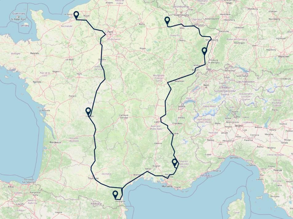 U begint uw Grand Tour met een heerlijk verblijf in het binnenland van Normandië, nabij het sfeervolle plaatsje Pont-Audemer. De bekende bezienswaardigheden van Normandië, zoals de krijtrotsen van Etretat en Honfleur, liggen op korte afstand van de accommodatie. U vervolgt uw weg naar Limoges, een authentieke stad naast het nog altijd verwoestende bloedbad van Oradour-sur-Glane. Hier zijn de resten van de oorlog nog letterlijk terug te vinden. Het dorpje is volledig achter gelaten en is nog in de originele staat ten tijden van de oorlog terug te vinden. In het zuiden van Frankrijk verblijft u onder andere in een verbouwd wijnhuis tussen de wijngaarden en wijnkelders. Hier kunt u het regionaal natuurpark van de Catalaanse Pyreneeën ontdekken waarna u uw weg vervolgt naar de Cote d'Azur. De Cote d'Azur heeft naast zon, zee en de prachtige stranden, ook vele grote en unieke steden om heerlijk in te verdwalen. Na de overweldigende Cote d'Azur is het tijd voor de pittoreske omgeving van de Elzas voor een glaasje tot in de perfectie gemaakte wijn.
