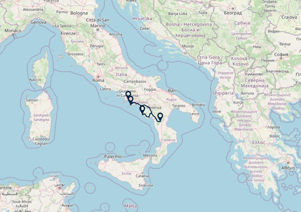 U begint uw reis in Napels; lang voor onze jaartelling werd de stad gesticht door Griekse kolonisten, die haar de naam "Neapolis" gaven. De route voert zuidwaarts naar het ongerepte Calabrië en eindigt weer in Campanië, vlakbij Sorrento.