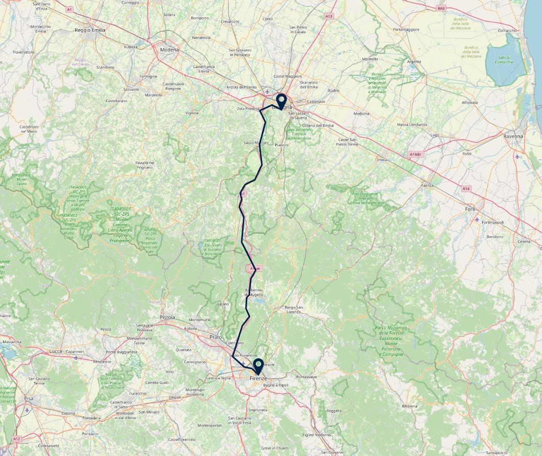 Route: Florence, Hotel Cellai Firenze - Bologna, Hotel Porta San Mamolo, 110 km (treinrit van ~ 40 minuten)