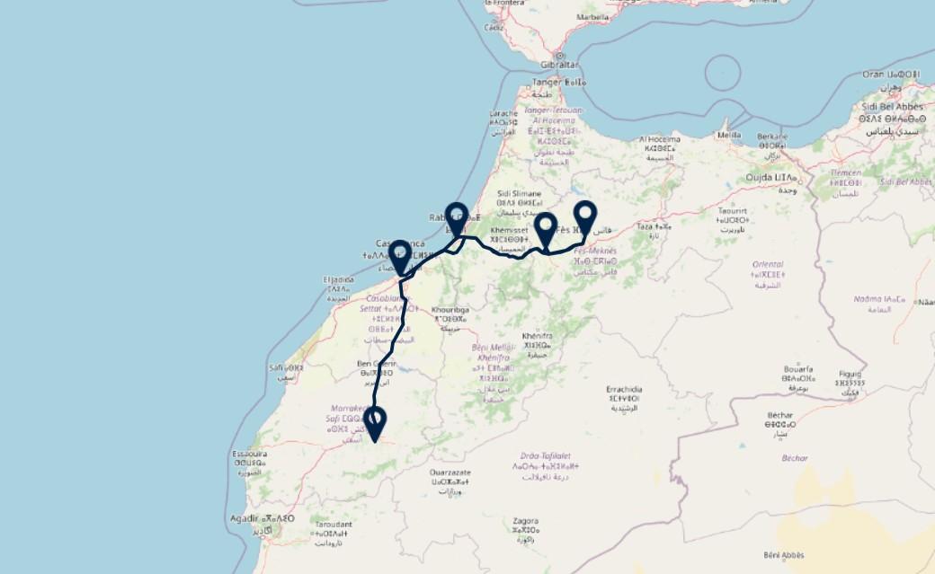 We verlaten het hotel in Fès en rijden naar Marrakech, een lange reis in de touringcar, maar een prachtige route. We rijden via een schilderachtige route door het Midden-Atlasgebergte en de vruchtbare Tadla-vlakte. Onderweg ontdekken we bergdorpen, cederbossen, Berberse markten en een adembenemende natuur. Deze route is ideaal voor reizigers die meer willen ervaren dan alleen het begin- en eindpunt.