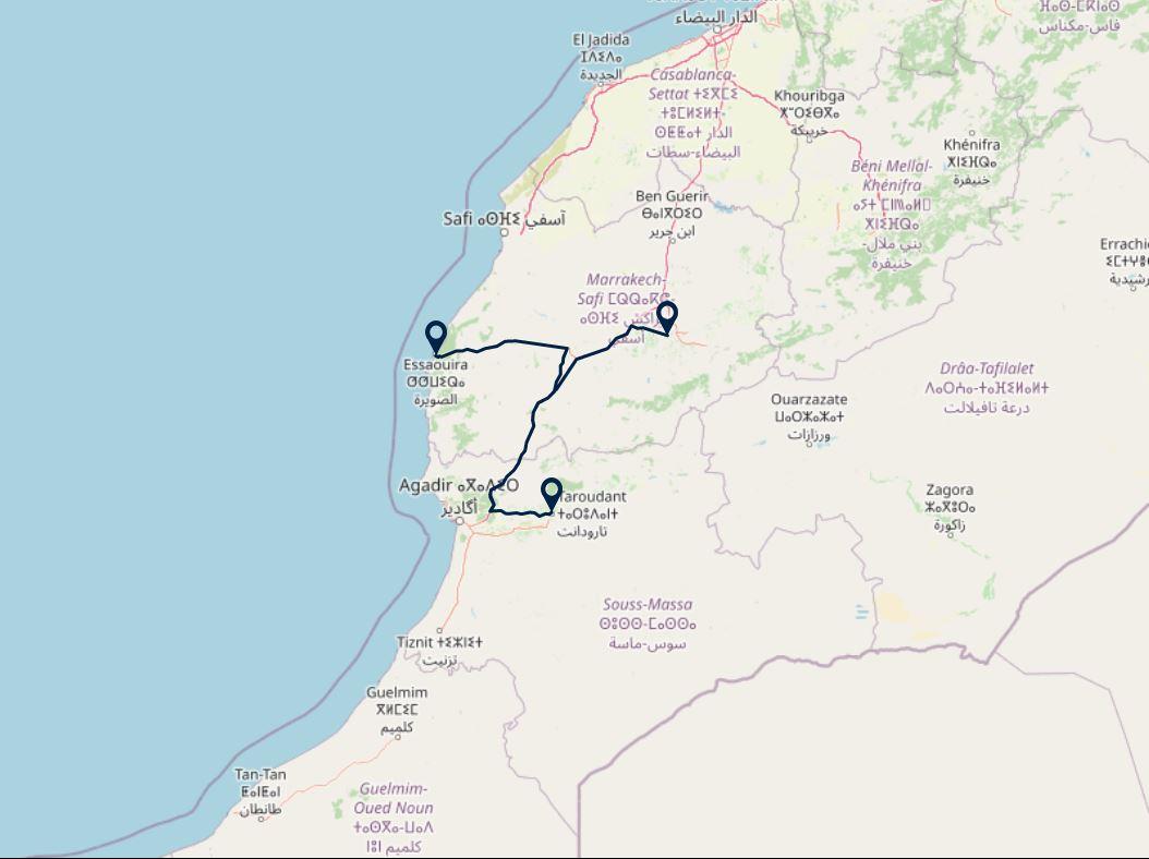 Route: Taroudant - Essaouira (ca. 3,5 uur rijden)