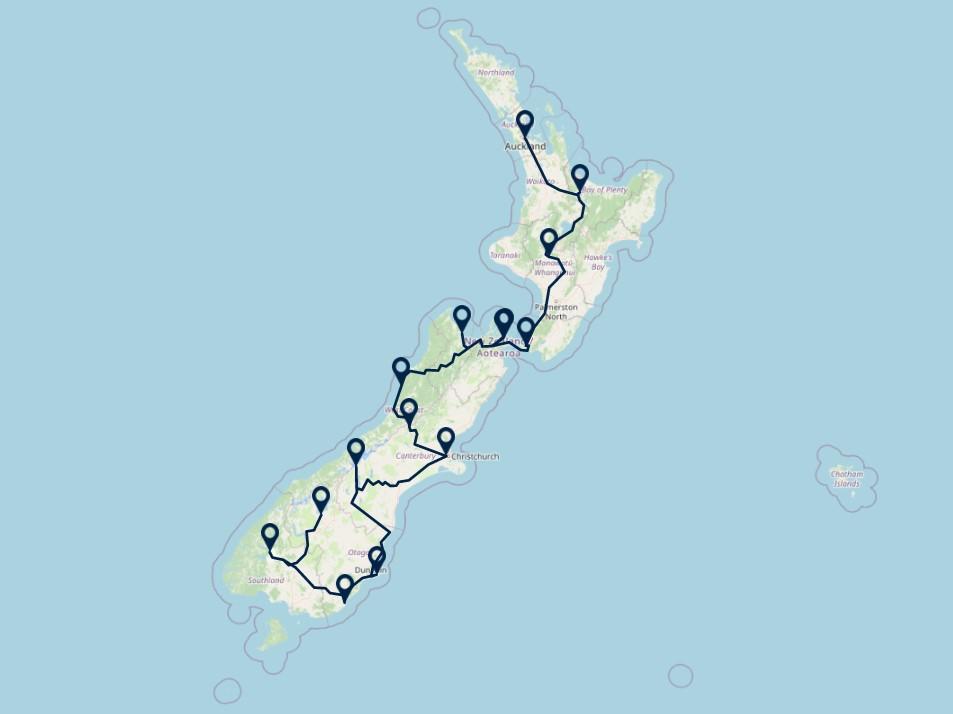 Deze reis is een voorbeeld van een reisroute van een rondreis Nieuw-Zeeland. Wilt u de reis aanpassen, inkorten of verlengen? Alles is mogelijk! U kunt uw wensen kenbaar maken via het offerteformulier. Wij hebben uitgebreide reiservaring in Nieuw-Zeeland en stellen graag, in samenspraak met u, de Nieuw-Zeeland rondreis samen die volledig aansluit bij uw wensen.