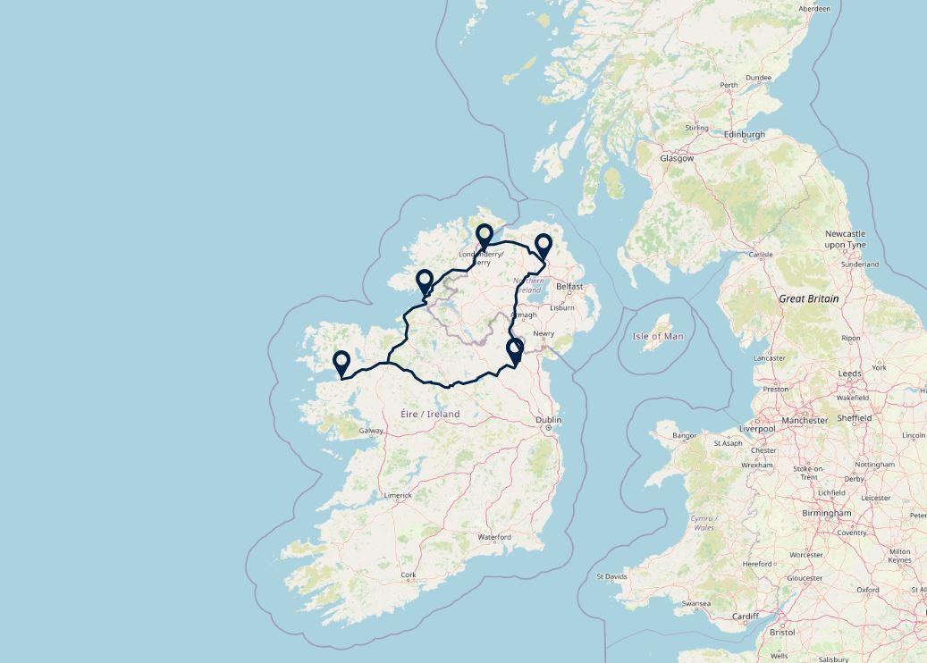 Rijdlangs de Causeway-kustroute en breng een bezoek aan de Giants Causeway. Maak een wandeling langs de ca. 40000 basaltzuilen en geniet van de prachtige vergezichten. Een bezoek aan het Dunseverick Castle is ook zeker de moeite waard. Bijzonder is de oversteek over de Carrick-a-Rede Rope Bridge (touwbrug). Na de oversteek kunt u het kleine Carrick Island verkennen. Bezoek vervolgens Bushmills, de oudste whiskey destilleerderi. Hier wordt al sinds 1608 whiskey gedestilleerd. U kunt hier een rondleiding reserveren, de giftshop bezoeken of een proeverij bijwonen.