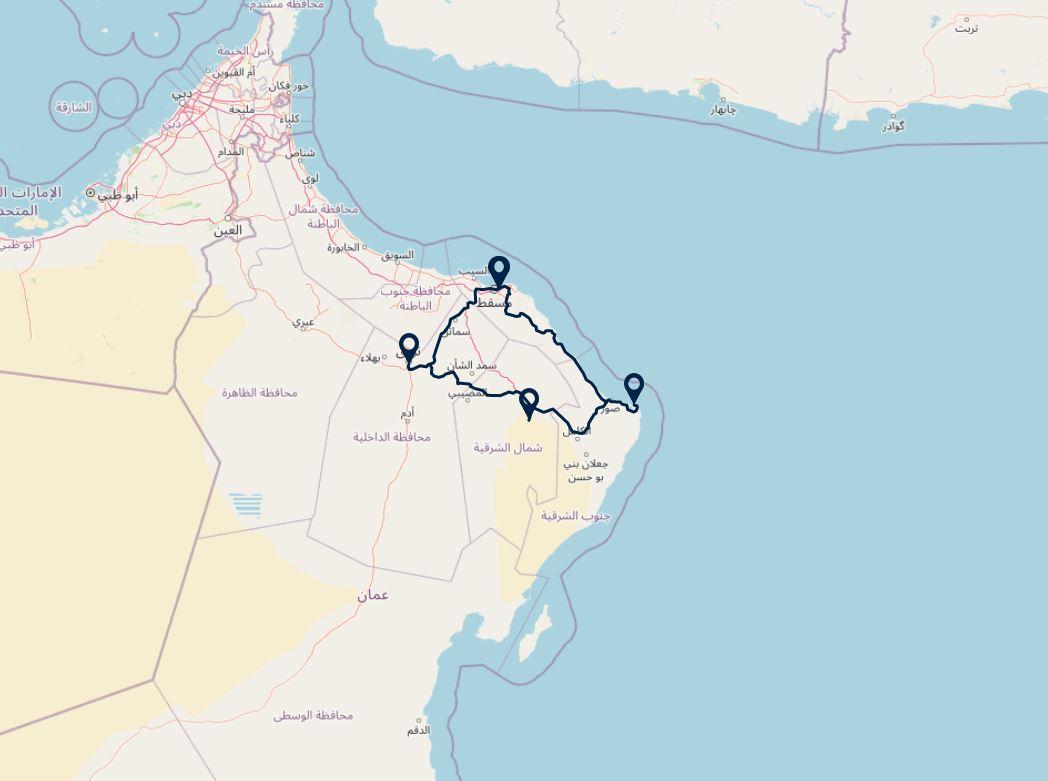 Bij aankomst op Muscat luchthaven is er een transfer geregeld naar uw hotel in Muscat. De huurauto wordt vervolgens de volgende dag bij het hotel in Muscat afgeleverd. U levert de auto weer in op dag acht bij uw hotel in Muscat. Op dag tien is er een transfer naar Muscat luchthaven geregeld.