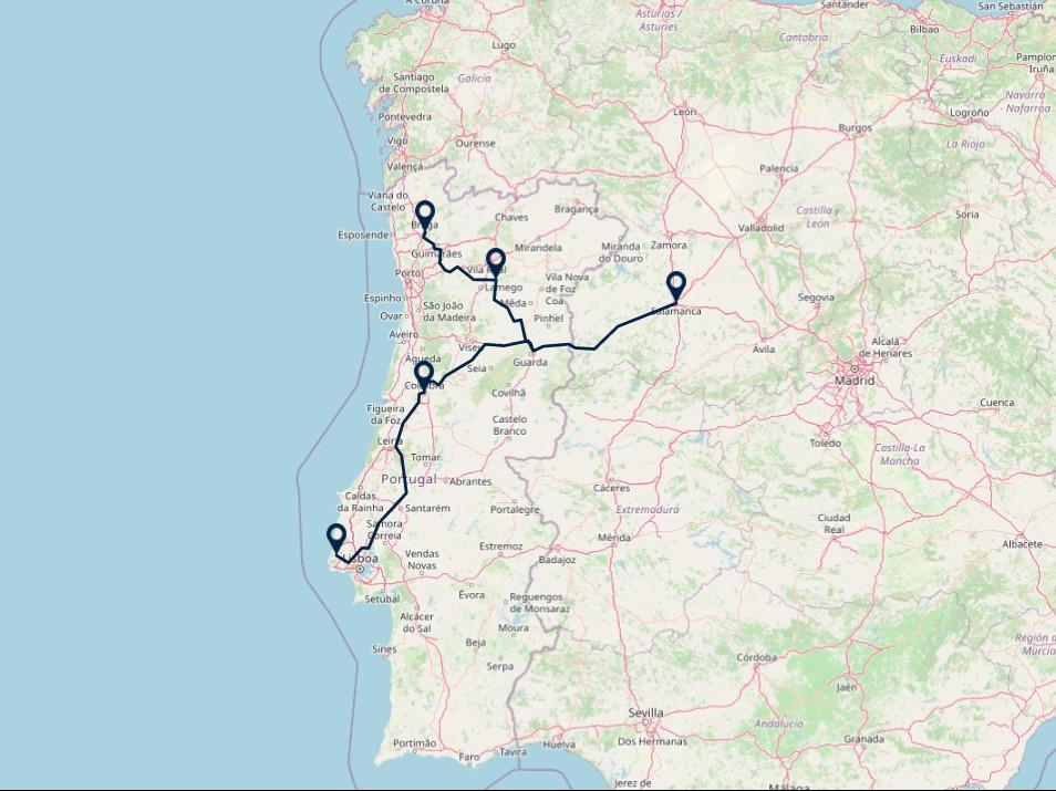 De reis begint in het sprookjesachtige Sintra, nabij bruisend Lissabon. Vervolgens ontdekt u Coimbra en hierna maakt u een uitstapje naar Spanje en verblijft u in Salamanca. Vervolgens verblijft u in de prachtige Douro vallei en u sluit de reis of in het historische Braga.