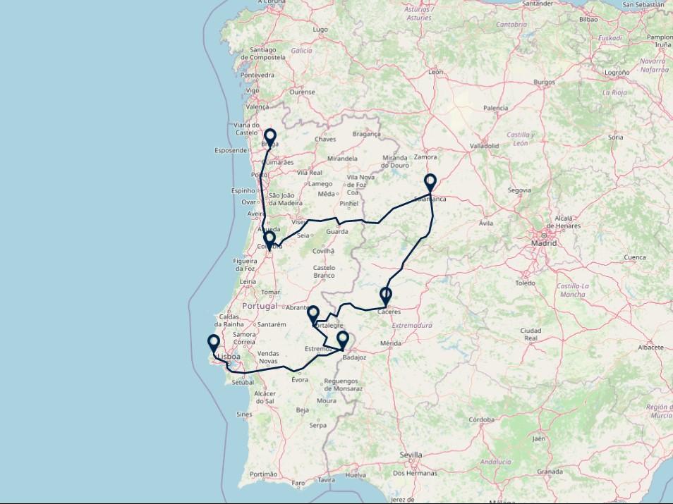Ontdek historisch Braga, de universiteitsstad Coimbra, de Spaanse steden; Salamanca en Caceres, de geschiedenis van de Alentejo en sluit af in het sprookjesachtige Sintra.