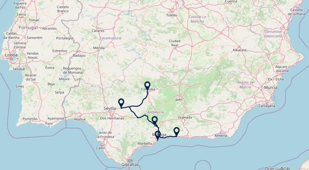 Zoals Nederland met tulpen en klompen gestereotypeerd wordt, wordt Andalusië dat met stranden, flamenco, fiestas, tapas en sherry; deze typering verwijst naar de ontspannen levensstijl van de Andalusiërs. Maar Andalusië heeft zoveel meer te bieden: een bijzonder rijke historie waarin de Moren zeven eeuwen de scepter hebben gezwaaid en een fascinerende erfenis hebben achtergelaten, bijvoorbeeld in Cordoba. Ook werelderfgoedstad Sevilla ligt op de route. Wilt u ook Granada en het beroemde Alhambra bezoeken, dan is dat - met een omweg - ook mogelijk.