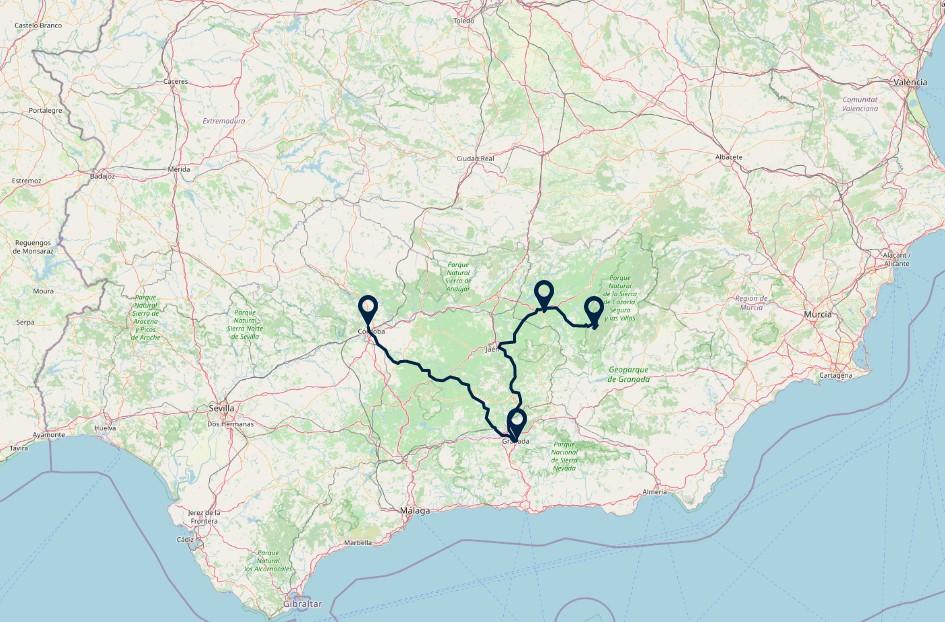 Op de luchthaven van Málaga staat de huurauto voor u klaar. U rijdt het binnenland in op weg naar Jaén, de stad van de olijfolie. Jaén heeft echter meer te bieden. Het stadsgezicht wordt bepaald door het Castillo de Santa Catalina, een Arabisch fort dat vooral opvalt vanwege zijn enorme toren. Jaén was nooit een grote belangrijke stad met sterke invloed op de regio. Die rol werd in het verleden gespeeld door Cordoba en Granada. Maar dat neemt niet weg dat Jaén redelijke welvaart heeft gekend, dankzij lood uit de omringende bergen en later de lucratieve productie van olijfolie. Jaén werd door de Moren "Geen" genoemd, halteplaats voor karavanen. Het fort op de strategische plaats tussen Andalusië en Castilië werd na de verovering door Ferdinand III Castillo de Santa Catalina genoemd. Het kasteel domineert nog steeds op een bergtop boven de stad. Andere bezienswaardigheden zijn bijvoorbeeld de kathedraal die hoog oprijst boven het centrum van de stad. Met de bouw ervan werd in 1492 begonnen en onder de Vlaams-Andalusische bouwmeester Andrés de Vandaelvira werd het werk grotendeels voltooid. In de kerk vindt u veel smeedwerk van de kunstenaar Bartolomé die veel hekwerken voor kerken en kapellen maakte. In het cultureel centrum Palacio Villardompardo kunt u ook de Baños Árabes bezoeken. De Capilla de San Andrés is een mudéjar kapel uit de 16e eeuw, waar een hoogtepunt uit het werk van eerdergenoemde Bartolomé te zien is.