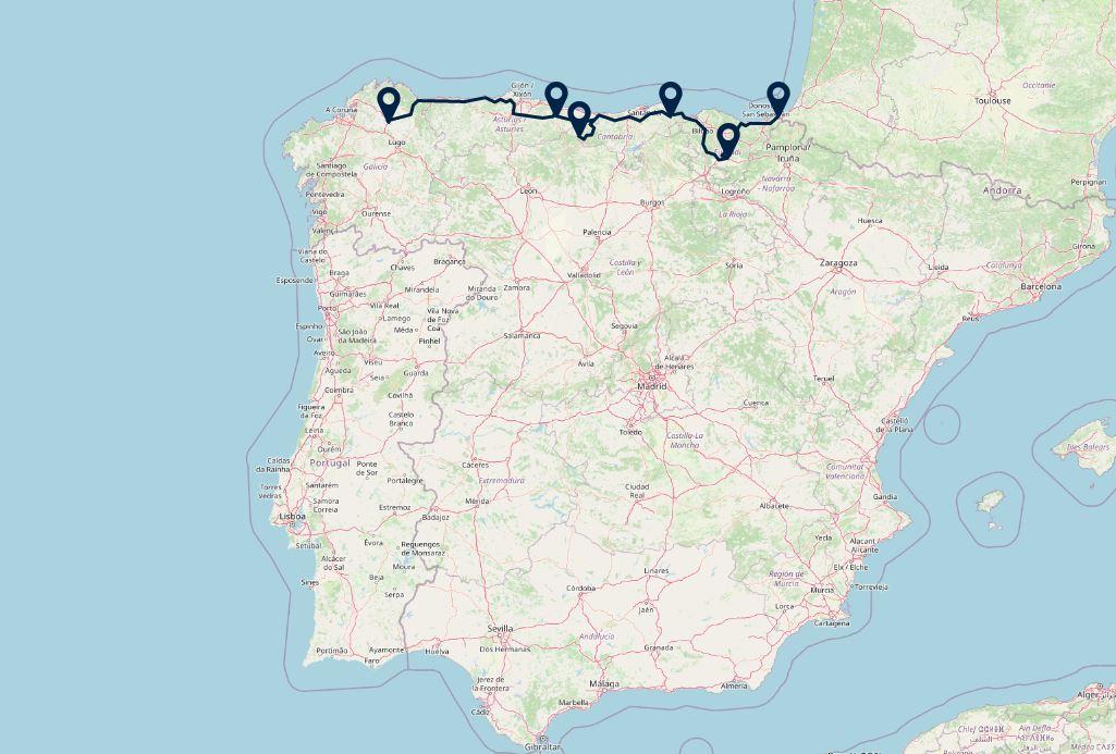 De noordkust staat bekend als het eeuwig groene deel van Spanje. Van de weidegronden in het binnenland tot aan de kliffen aan zee is alles met een groen laagje bedekt. De bergen lopen er door tot aan de zee. De Atlantische Oceaan en de Cantabrische Zee hebben spectaculaire kliffen gevormd die bescherming bieden aan kleine havens, fijne zandstranden en verborgen inhammen die alleen de meeuwen kennen. De inwoners, Kelten, Asturiërs, Cantabriërs en Basken, werden beschermd door de natuur en konden zo weerstand bieden aan de Romeinen, de Arabieren en de invasies vanuit de zee. In Galicië ontstond in Santiago de beroemdste van alle bedevaarten. In Asturië begon de Herovering, de strijd tegen de Arabieren die bijna zeven eeuwen zou duren. Vanuit Cantabrië vertrokken in de 9e eeuw de Foramontanos, die het door oorlogen verwoeste Castilië herbevolkten. In het Baskenland is de oudste westerse taal behouden gebleven: het Baskisch. De vier gemeenschappen aan de noordkust zijn altijd gemakkelijker via de zee te bereiken geweest dan over land. De streken landinwaarts, bergachtig, dichtbegroeid en vrijwel zonder paden, zijn door slechts weinige reizigers doorkruist; de meesten van hen waren op weg naar Santiago de Compostela. Het zijn verborgen plekken die daardoor niet alleen het landschap, maar ook de gewoonten en tradities in zuivere vorm hebben kunnen behouden. Tijdens deze reis door het Groene Spanje rijdt u langs de indrukwekkende kustlijn, maar er is ook veel tijd voor het binnenland, zoals de natuur rondom Argómaniz en het Nationaal Park Picos de Europa.