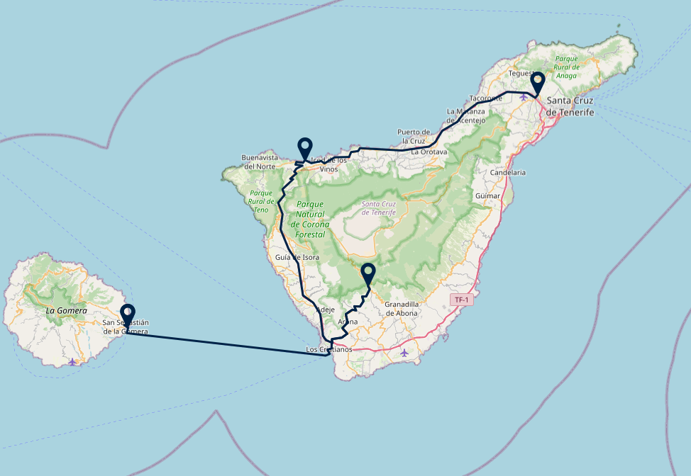 Route: Vilaflor - Los Cristianos (25 km) | Ferry overtocht | San Sebastian de La Gomera - Parador de La Gomera (1,5 km)