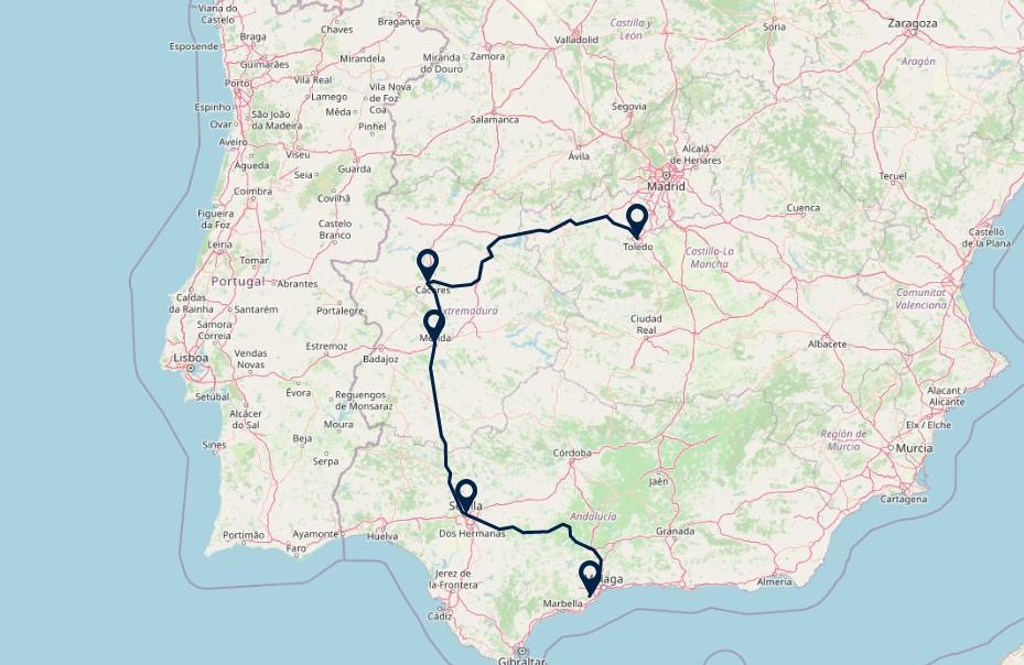 Bij aankomst op Madrid luchthaven rijdt u naar de historische stad Toledo. Maak kennis met de pareltjes Cáceres en Mérida in Extremadura en sluit de reis af in Andalusië.