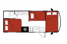 De populairste camper uit de vloot van El Monte biedt ruimte voor een gezin van 4 personen. Achter in de camper is een vast 2-persoonsbenedenbed. Boven de bestuurderscabine bevindt zich eveneens een 2-persoonsbed. De camper beschikt over een keuken, toilet/douche en zithoek. De zithoek kan omgebouwd worden tot een kinderbed.