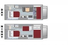 Deze grote motorhome biedt voldoende plaats aan het hele gezin. Door de slide-out heeft u op de camping extra ruimte in de camper. Er is een vast bed in een aparte ruimte achterin de camper, ook de douche en toilet zijn van elkaar gescheiden. Er is een 2-persoonsbed boven de cabine en een stapelbed met 2 1-persoonsbedden. Ook de zithoek kan omgebouwd worden tot 2 1-persoonsbedden. Een keuken, douche en eethoek maken de camper compleet.