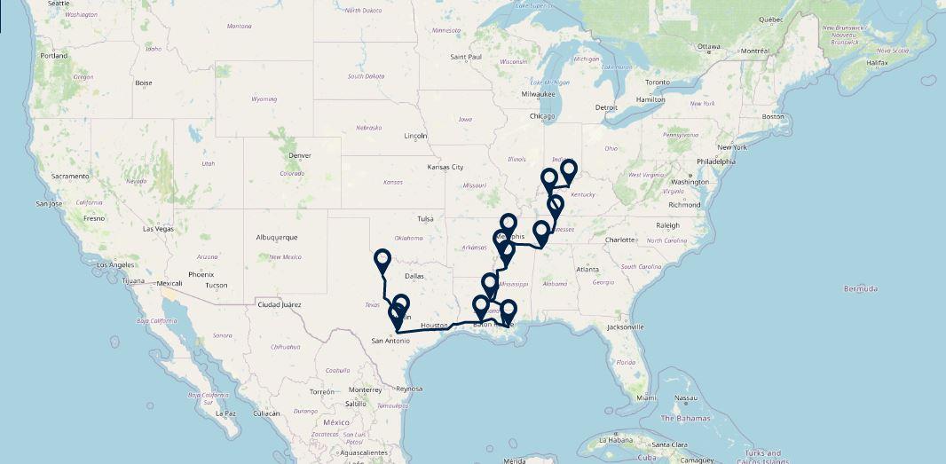 Route: Lafayette - New Braunfels/Gruene, 600 km